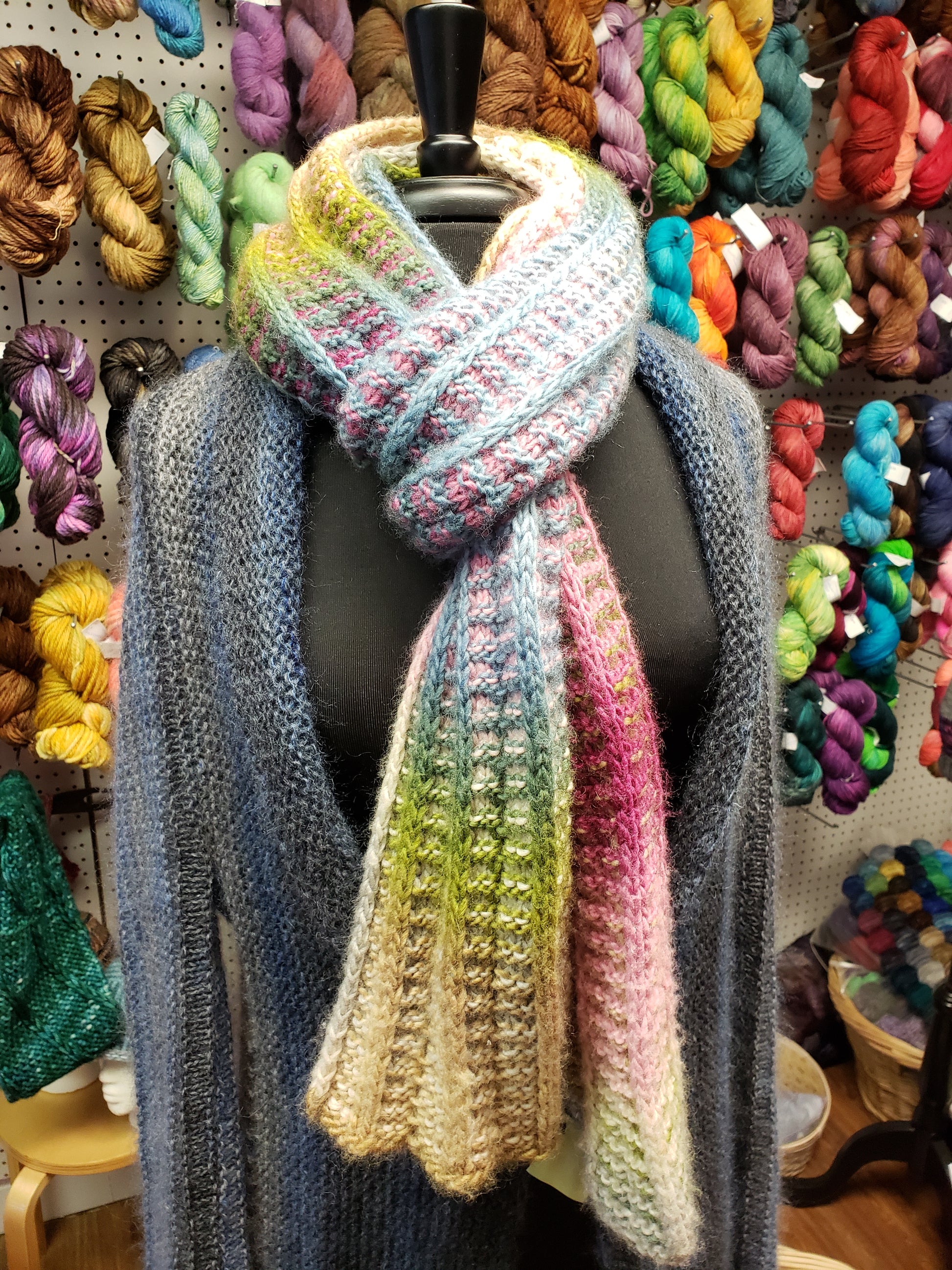 Our Frosted Multi Scarf can also be made with delicious Amitola Grande for a fuller, fluffier scarf on bigger needles.