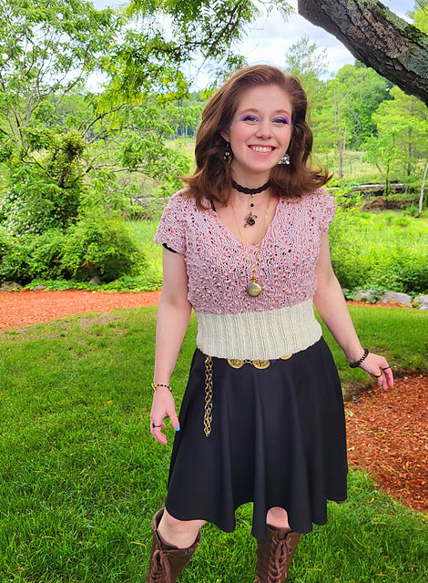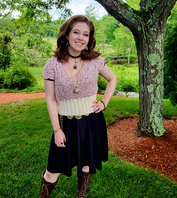 The story of this top – it was meant to be a full, long sleeve sweater, but as I was knitting it, it just looked so tiny. I kept checking my gauge swatch and notes and going back and forth. It should be right, why did it look so stupidly small? I kept going though, but got stalled at the sleeves when I started really doubting the size. It sat under some other projects for quite a while and when it finally saw the light of day again, I had had it. I started ripping it out, sleeve first. Then, I thought maybe it might be smart to put it on my daughter (the lovely model) and try to figure out what went wrong. Well, nothing went wrong. It fit her perfectly and just as intended. As I picked at it and stared in disbelief, mumbling about the sleeves and the collar, she said, “Um, I’d wear it just like this.” And then I really looked at her – and she was totally right. It looked super cute as is, so we decided to let it be just the way it wanted to be. It is super quick, fun knit, and really comfy!