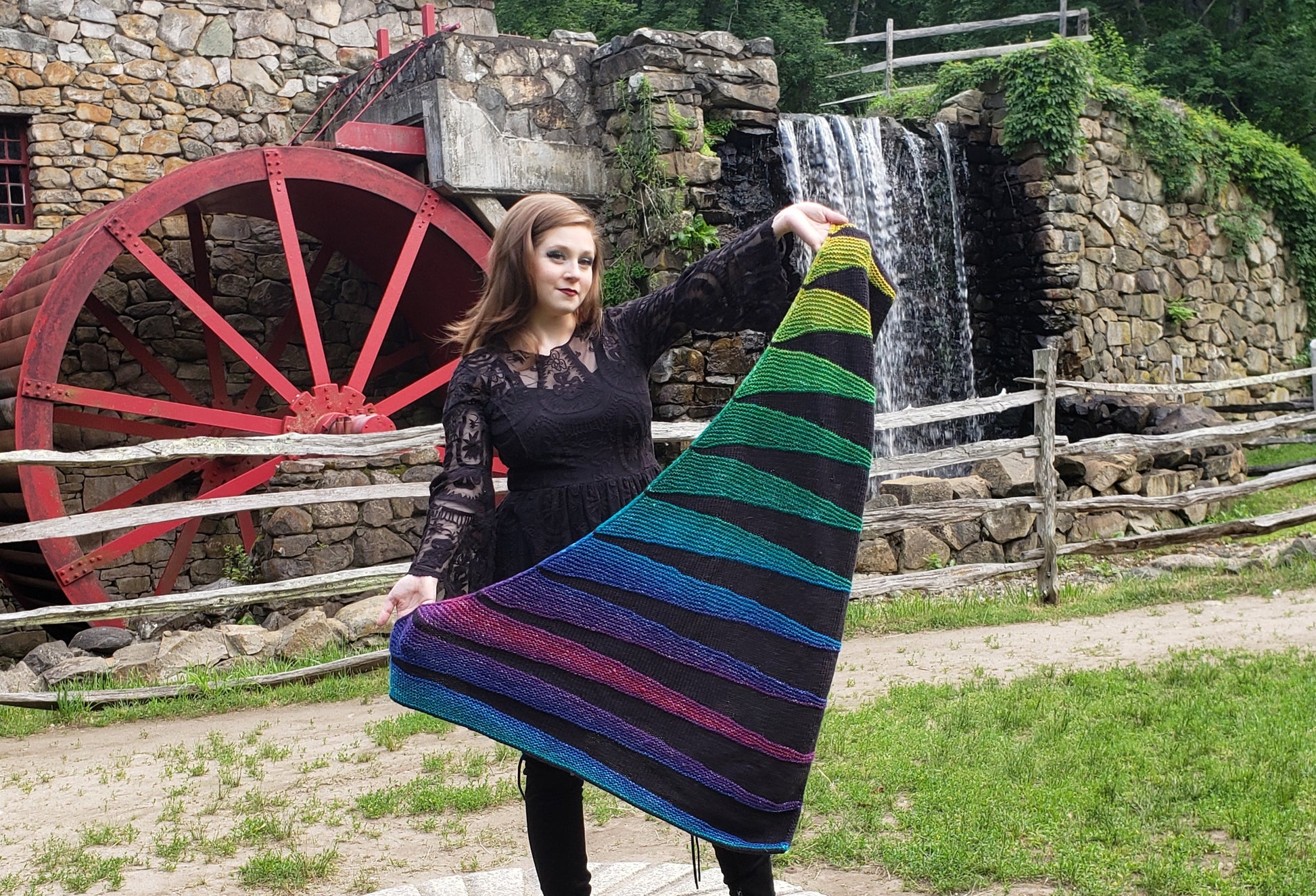 Wayside Waves is the gorgeous shawl pattern made just for the Greater Boston Yarn Crawl 2021! It is made with delicious and delightful Juniper Moon Farm Cumulus Cumulus Rainbow - a treat for your hands and super squishy to wear! For this kit, you'll need to choose a neutral and a rainbow color - you will receive 2 of each. You can also build your own with 2 solids or 2 Rainbow by clicking the yarn link above. The sample that you see here is made with #37 and #201. This kit comes with all the yarn you need and a pattern download. Click "view order" on your order confirmation, then there will be a link that says you have Ravelry downloads. Click that and your pattern will appear!